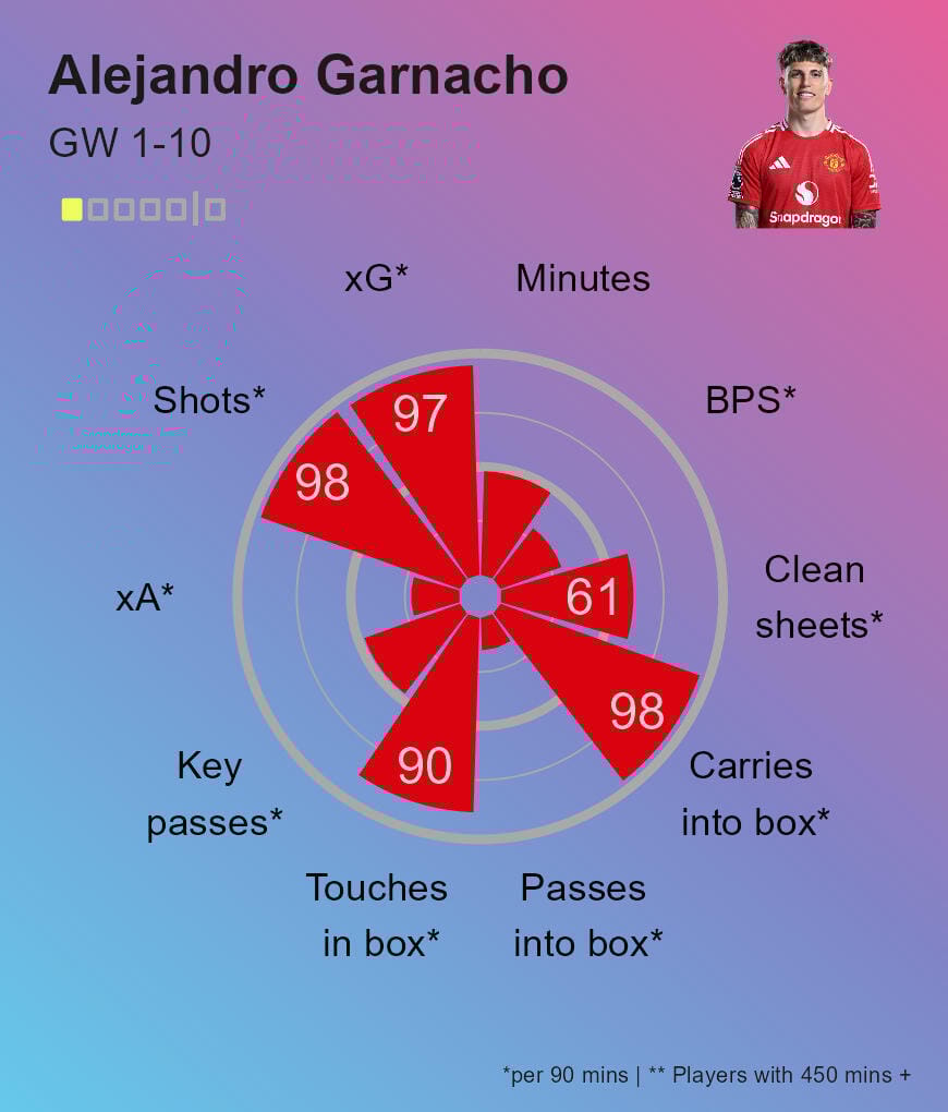 Bruno Fernandes will be a popular choice for this run, but Alejandro Garnacho has been a standout attacker among midfielders in xG this season.