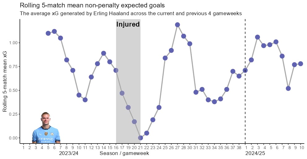 The graphic shows rolling mean expected goals - the average expected goals put up by Haaland across the past five matches for last season and this season.