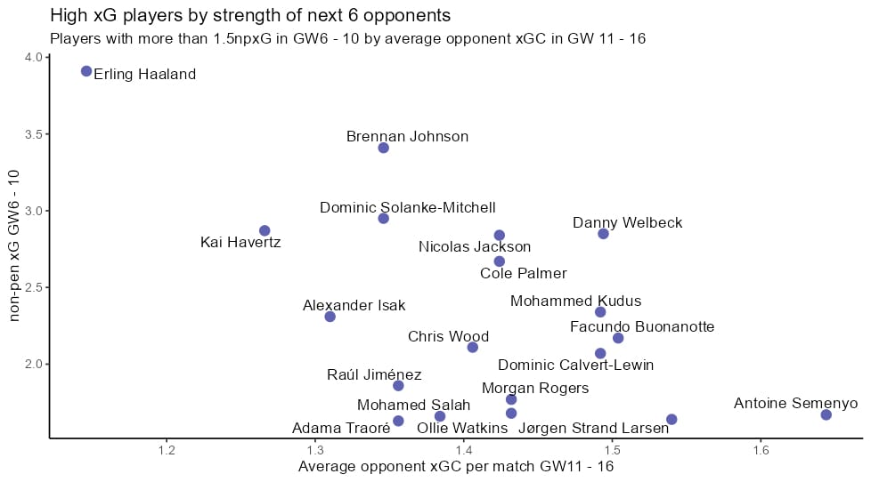 There are lots of players with higher xG than Antoine Semenyo, but the average xGC per match of the next 6 teams he faces is quite a bit higher than any other player.