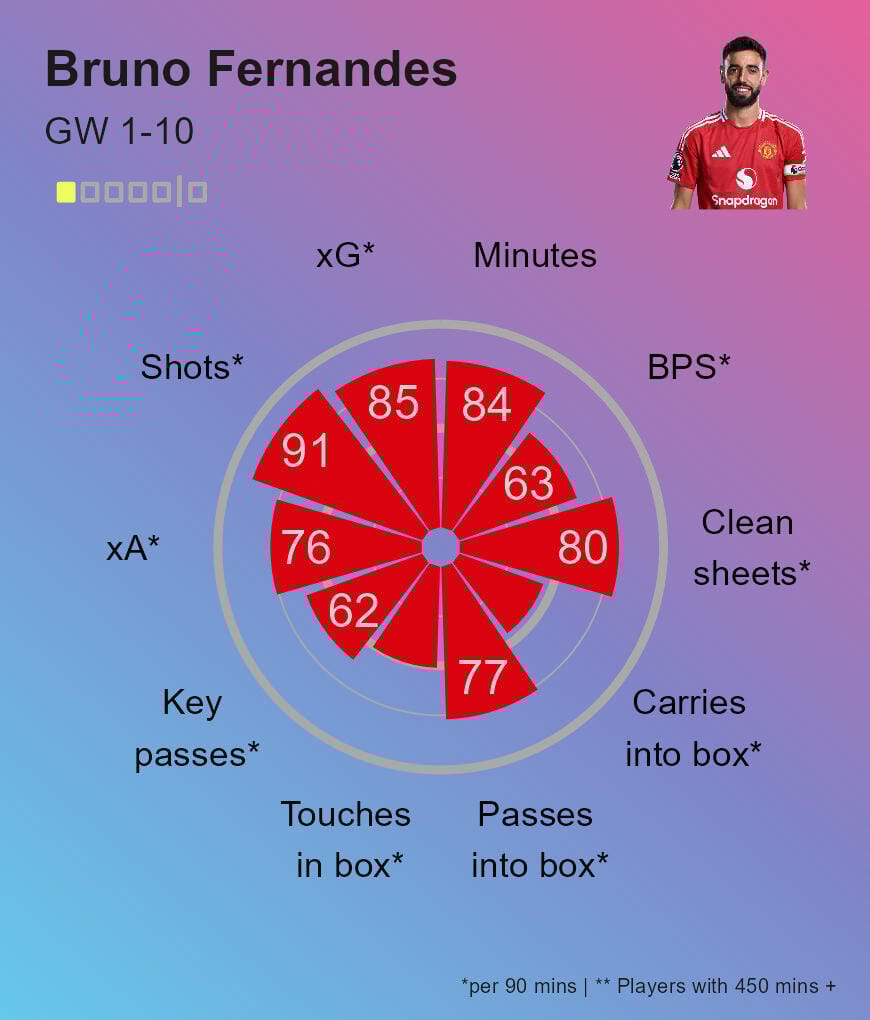 Bruno Fernandes is also fairly high in the midfielder rankings for xG and shots per 90. But he lags behind Garnacho in xG, shots, and touches and carries into the box, and will eat a bigger hole in your budget (£8.2m vs £6.3m).