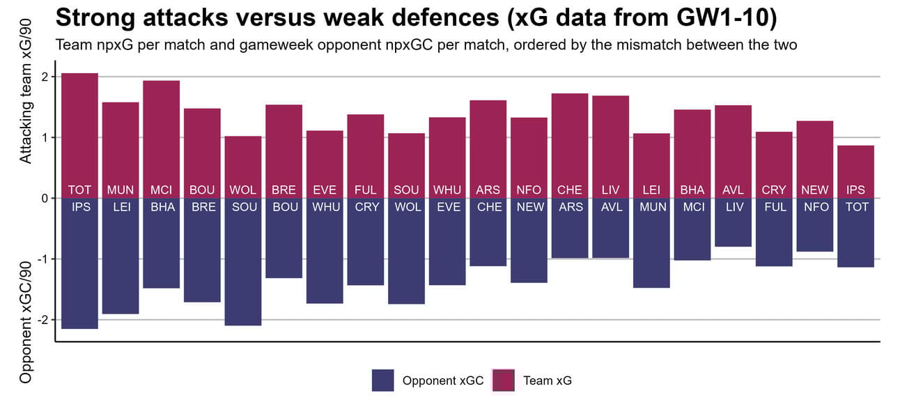 Tottenham remained at the top of the xG per match standings after their 4-1 win over Aston Villa in Gameweek 10, and face the poorest defence — Ipswich. We’re unlikely to get early team news on this one but Spurs will be looking to build momentum after a stop-start early campaign.