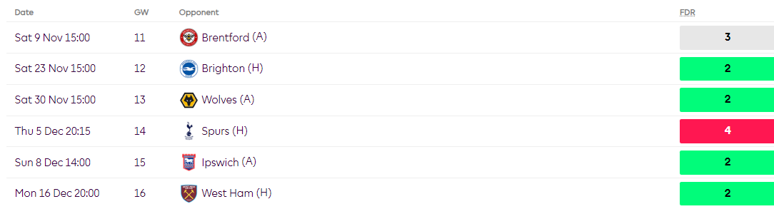 Manchester United face Leicester (H), Ipswich (A), Everton (H) in their next three. Leicester and Ipswich are two of the three worst defences by xGC (expected goals conceded) so far this season.