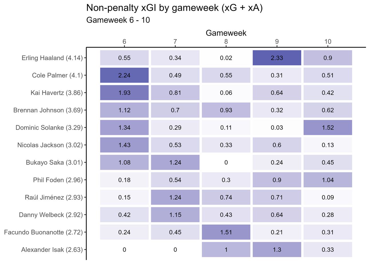 Of those three, Welbeck and Jimenez have put up strong xG numbers in the last few matches. Chris Wood doesn’t quite make this chart but he isn’t far behind on 2.16 non-penalty xGI for Gameweek 6 to 10.